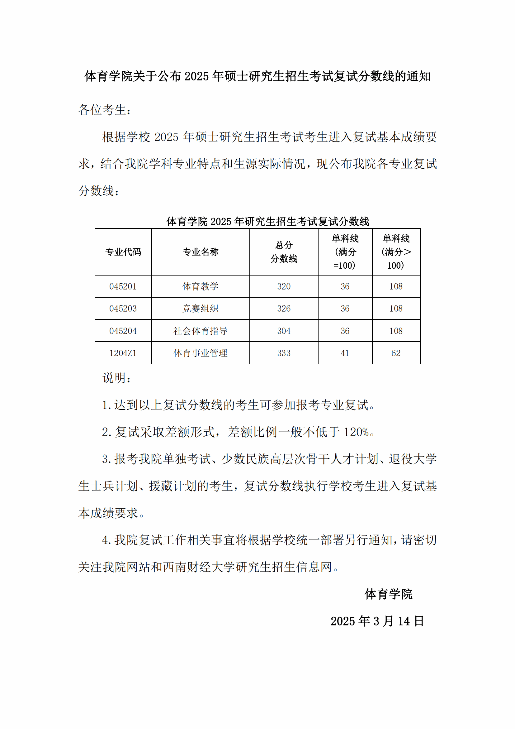 体育学院关于公布 2025 年硕士研究生招生考试复试分数线的通知
