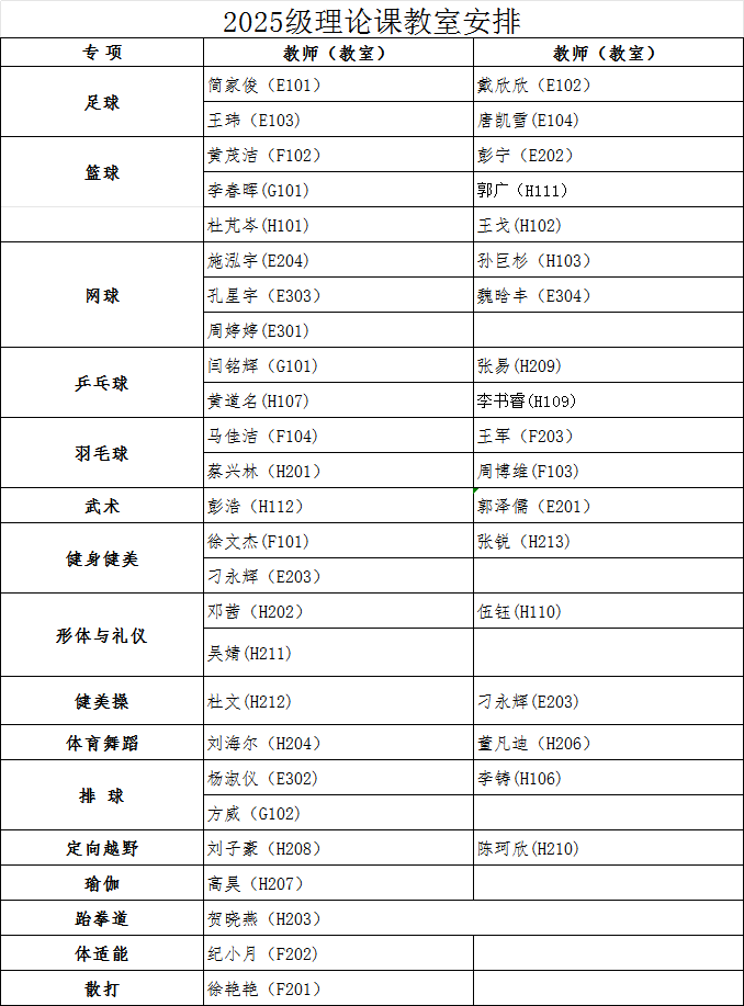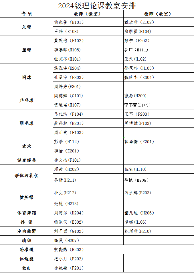 经教务处同意,本学期2024级、2025级本科生第1周体育课为体育教学理论课,3月9日起恢复户外教学。根据教室资源状况,现将理论课具体安排通知如下: